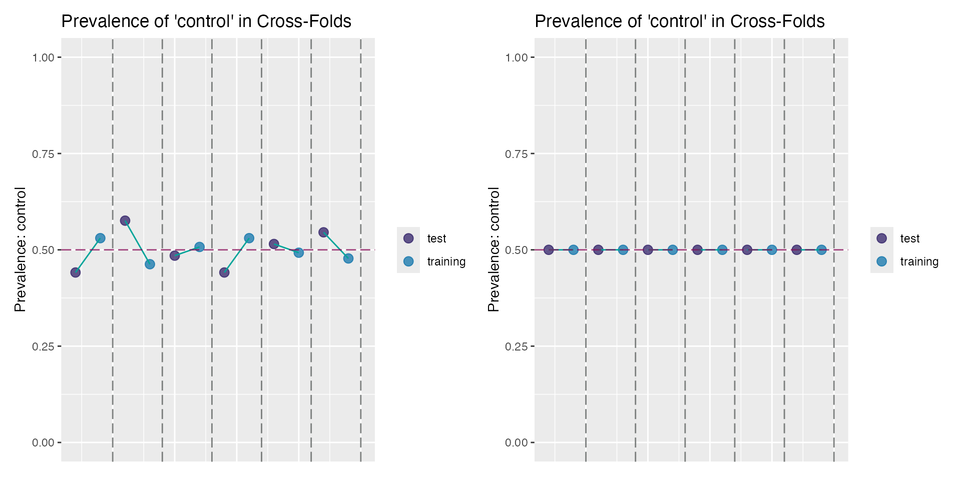 This should be most evident when comparing the folds with and without forced stratification. Below is a sample plot of the cross-validation folds without stratification (left) and after an update to the object to include stratification (right):