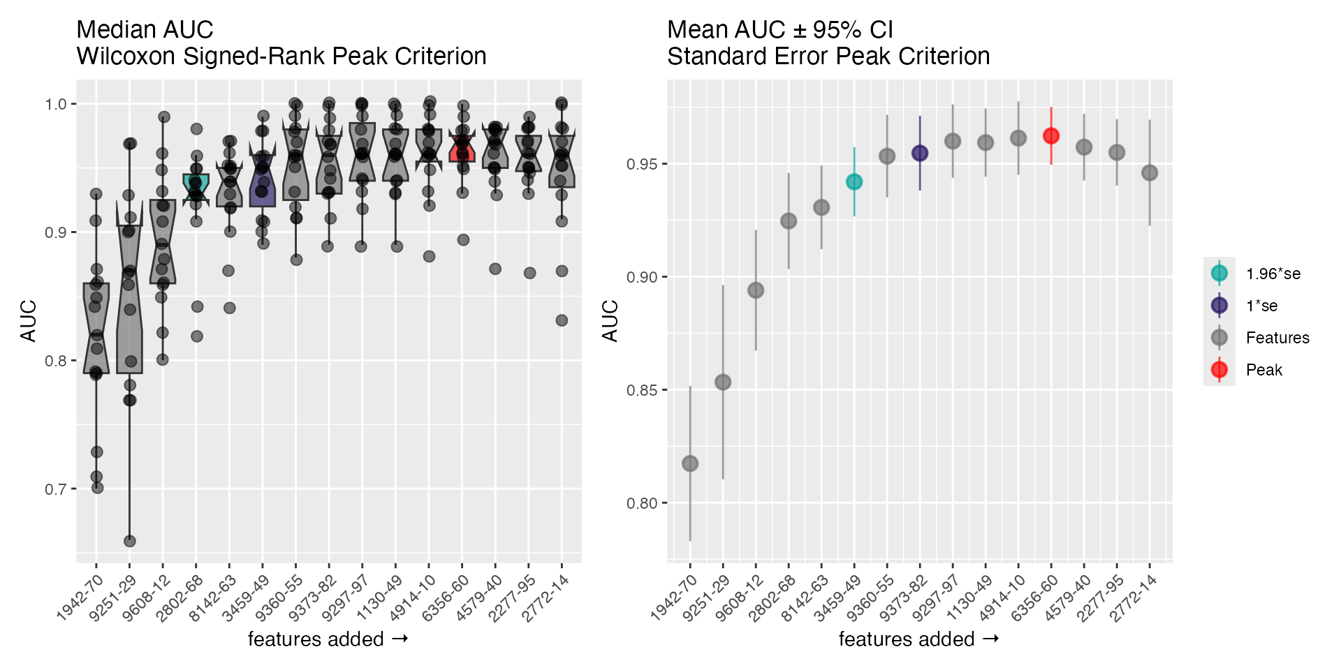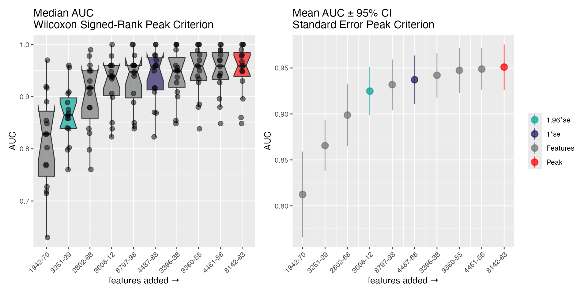 of the selection algorithm, and highlights the peak (AUC) and the models