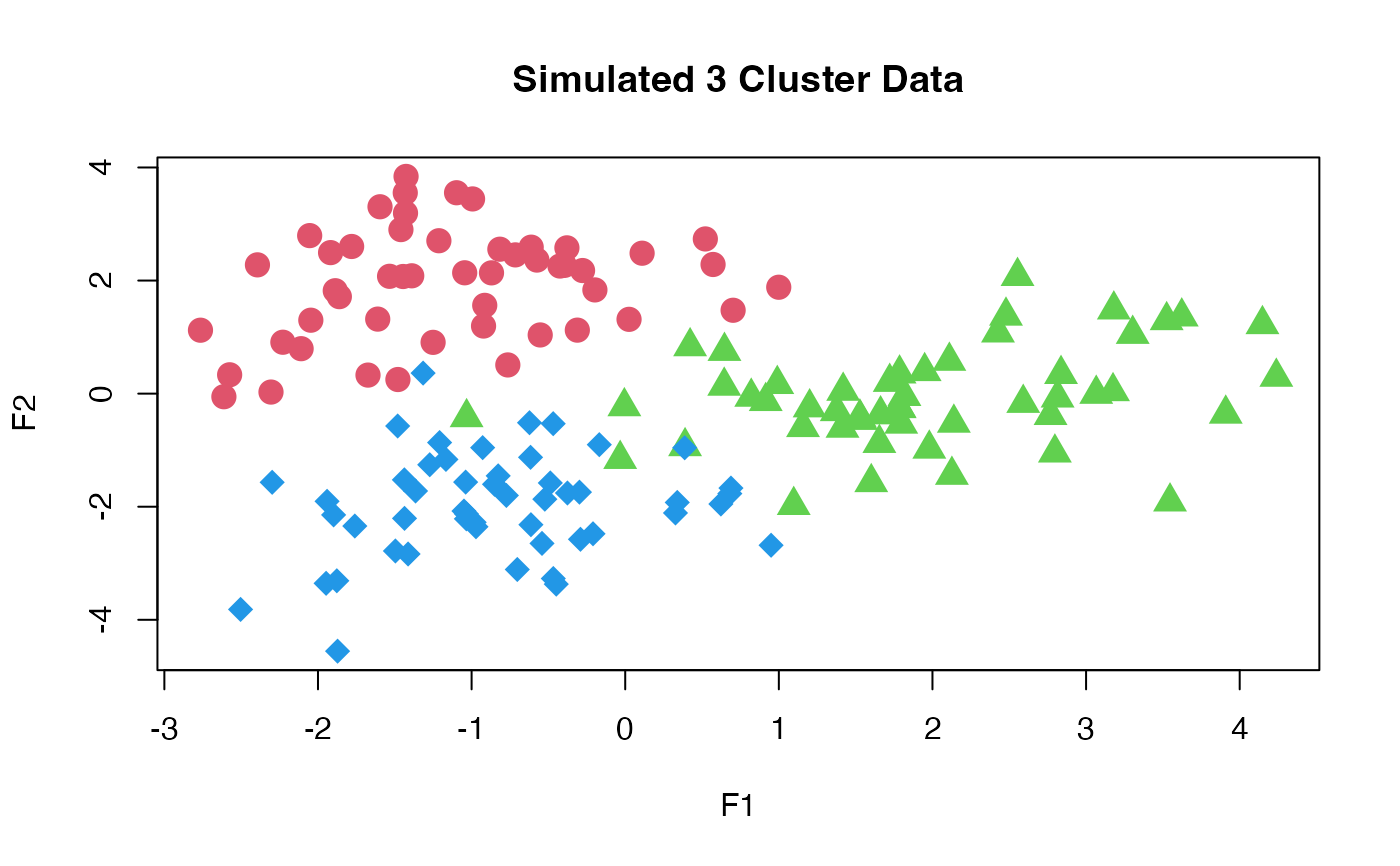 clust_data: The original clustering example data from the Progeny Clustering paper. A 2 feature data set example (see references) in the example illustration in Figure 1, page 3.progeny_data: A simulated clustering data set generated to contain 3 true clusters in bivariate space. There are 2 features, named "F1" and "F2" and 150 observations.